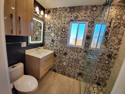 Feel refreshed in your own private bathroom with fluffy 100% cotton bath towels! Spacious walk-in shower with designer tiles, glass shower doors, hand-held and rain shower, bench, and large niche for your soaps and such. The vanity has huge drawers and is topped with modern lighting and a lighted mirror. There is a large wall cabinet for extra storage.