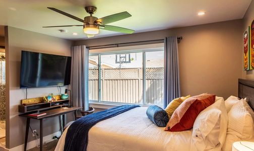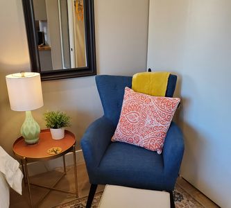 Brand new comfortable Queen bed with 100% cotton linens and fluffy new pillows. The bathroom has a barn door for more floor space, large shower with a bench and rain shower, lighted mirror, lots of storage and designer tile. Super Fast WIFI (1000!) for the work at home zoom calls and smart TV and a full sized desk and a comfy chair. The kitchenette is equipped with a medium sized refrigerator, Keurig coffee maker (a start of coffee pods, oatmeal and teas), dishes for 2, glasses, wine glasses, storage containers, towels, and cabinet storage/counter space. Storage includes a chest of drawers, closet organizers, luggage holder, and 2 large closets with shelves. New iron and ironing board and broom with dustpan are located in the closet.