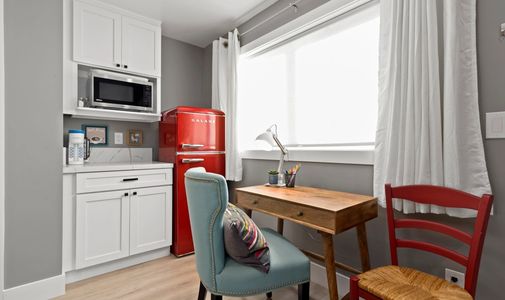 Our signature red retro refrigerator sets the tone for our mini kitchenette. White built-in shaker cabinets with quartz countertops provide storage for the microwave, Keurig, electric kettle, dishes, glasses and more! If you don't find what you need here, you can use the common area kitchen tools in the finished garage. Our kitchenette comes with a starter pack of coffee pods, teas and oatmeal.