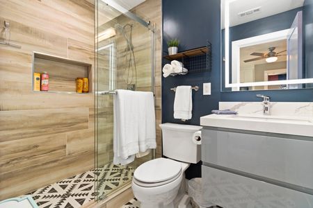 Feel refreshed in your own private bathroom with fluffy 100% cotton bath towels! Large walk-in shower with designer tiles, glass shower doors, magnetic hand-held shower, and large niche for your soaps and such. The floating vanity boasts large drawers and is topped with modern lighting and a lighted mirror.